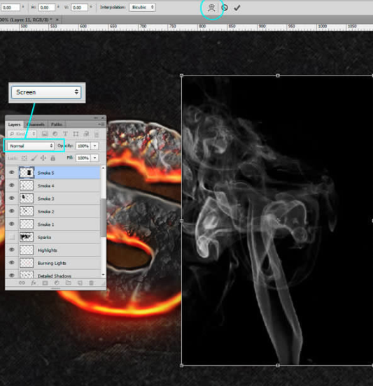 미리 다운로드 해 놓은 연기 질감 소재를 Photoshop에서 열고 도구 상자에서 "이미지"> "색상 보정"> "채도를 낮게"를 적용합니다. 흑백으로 된 텍스처 소재를 캔버스로 이동하고 "편집"> "자유 변형"> "워프"기능을 사용하여 텍스트에 맞게 모양을 변경합니다. 불필요한 부분은 "지우개"에서 삭제해도 상관없습니다.
