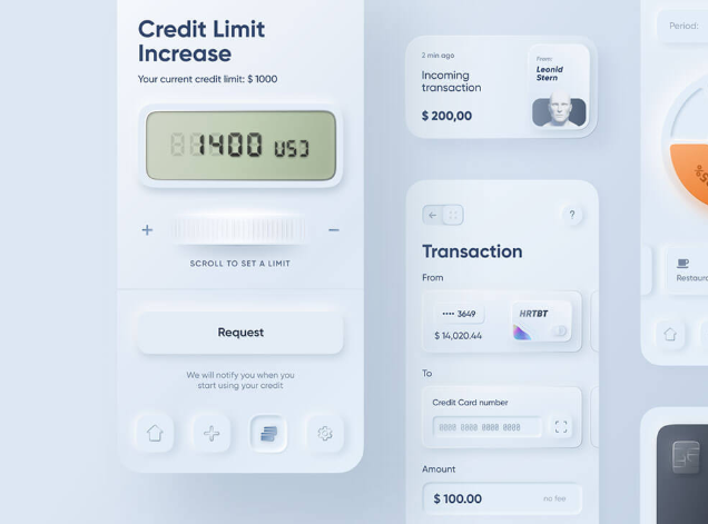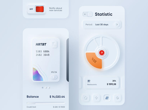 dribbble에서 4500 이상의 호가를 가진 뉴모피즘의 주동자가 된 작품 Skeuomorph Mobile Banking by Alexander Plyuto