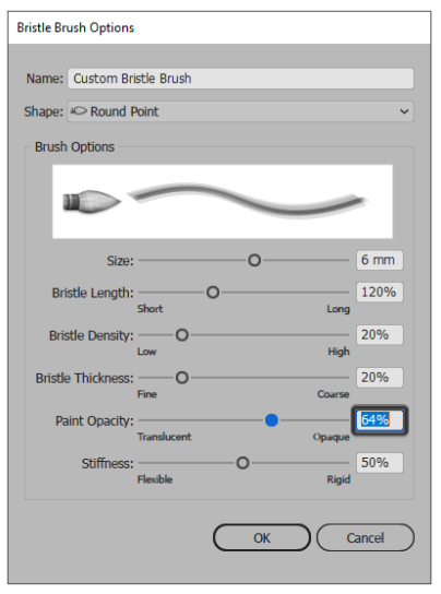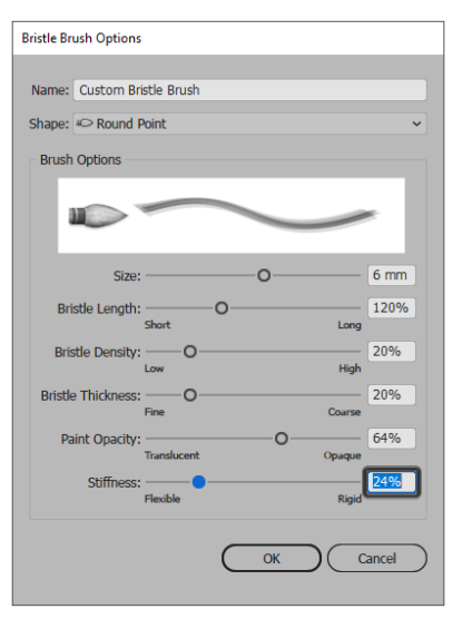마지막으로 강모의 강성을 제어하는 Stiffness 가 있습니다 . 사용하는 값이 낮을수록 강모가 더 유연 해져서 추적 된 페인트의 모양에 영향을 미칩니다.