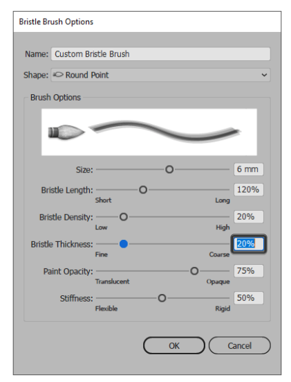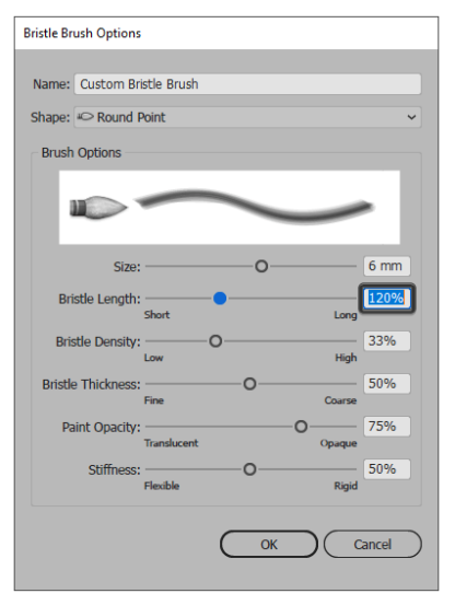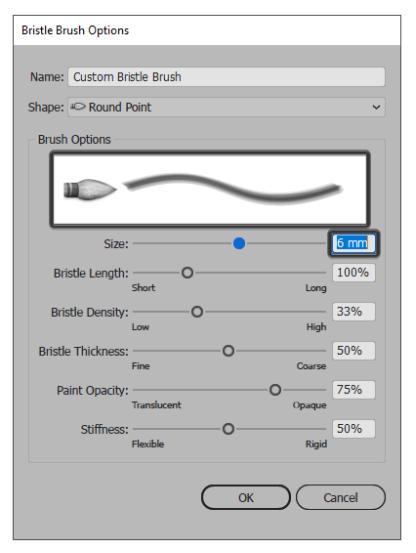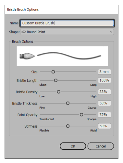 확인 을 누르 자마자 Illustrator는 강모 브러쉬 옵션 창을 불러 와서 새 브러쉬에 사용자 정의 이름을 지정한 다음 다른 설정을 미세 조정할 수 있습니다. 지금은 나중에 쉽게 식별 할 수 있도록 이름을 지정하겠습니다.