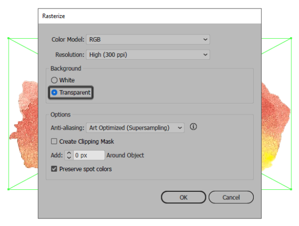 Illustrator에 파일을 배치 한 후에는 팝업 창에서 배경 을 투명 으로 설정하여 오브젝트> 래스터 화로 이동 하여 파일을 래스터화 해야합니다 .