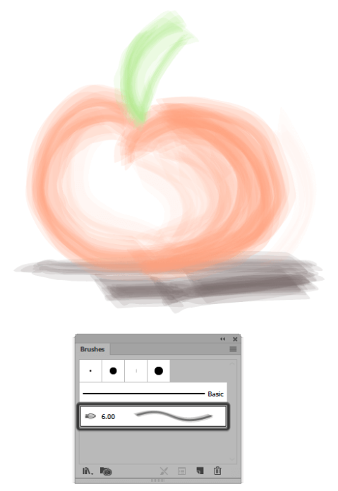 브러시를 사용하려면 먼저 획 의 색상을 설정 한 다음 이전과 동일한 프로세스를 따라 브러시 패널 내에서 브러시 를 선택한 다음 페인트 브러시 도구 (B) 를 사용하여 원하는 브러시 획을 그립니다. .