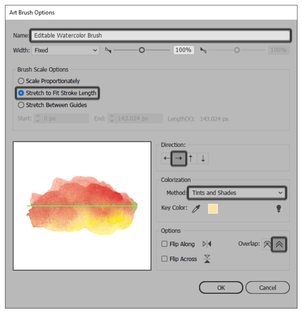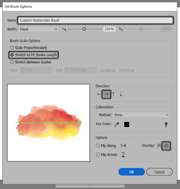 새로운 아트 브러시 옵션 프롬프트가 나타나 이름을 포함한 일부 설정을 조정할 수 있습니다. 당신이 지금해야 할 일은은 선택입니다 방향 당신이 있는지 확인했습니다 후 브러시, 그리고 맞춤 스트로크 길이에 스트레치 하고 모서리를 조정하고 중복 방지 주름 검사, 단순히 클릭하는 옵션을 확인 .