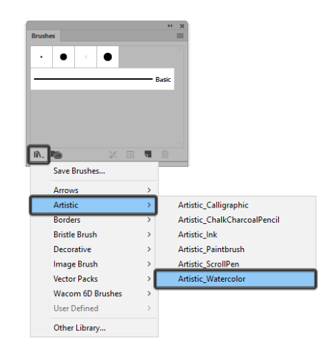 위로 가져 브러쉬 패널을, 다음을 클릭 브러시 라이브러리 메뉴 에 왼쪽 하단에 위치하고 있으며, 탐색 예술> Artistic_Watercolor.