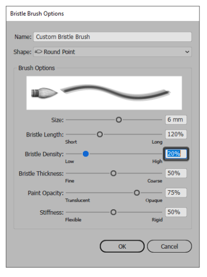 다음으로 브러시 끝에서 발견되는 강모 수를 제어하고 브러시 크기 및 강모 길이를 기반으로 계산되는 Bristle Density 가 있습니다 .