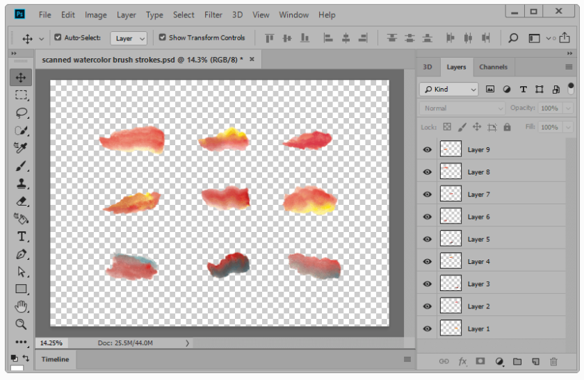 다음으로, 각각의 브러시 스트로크 세그먼트를 분리 한 다음 고유 한 투명 이미지 파일로 저장합니다. 작업이 완료되면, 다시 가서 일러스트 레이터 와 새 문서 (생성 제어-N을 ), 다음으로 이동하여 그 안에 원하는 이미지를 배치 파일]> , 또는 사용하여 Shift 키를 제어-P의 키보드 바로 가기를.