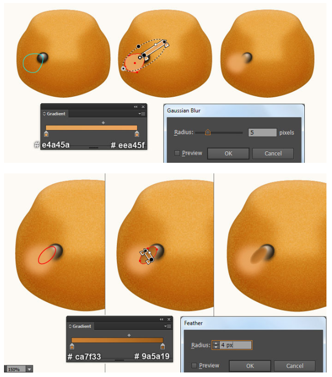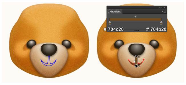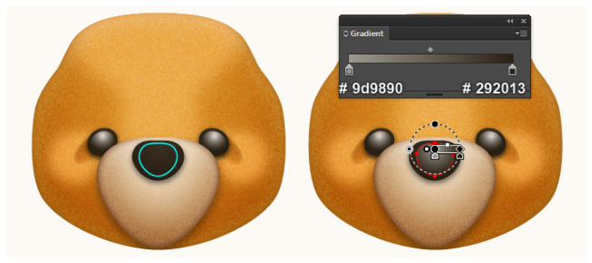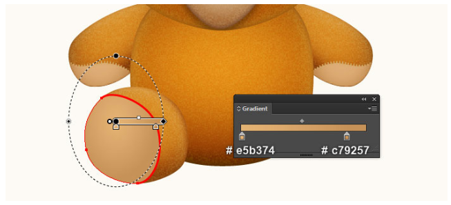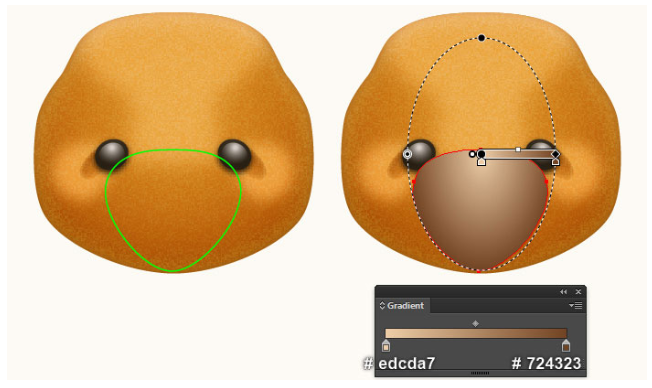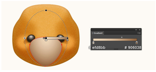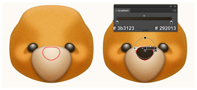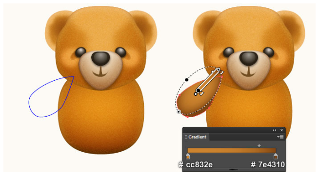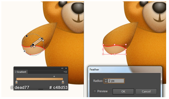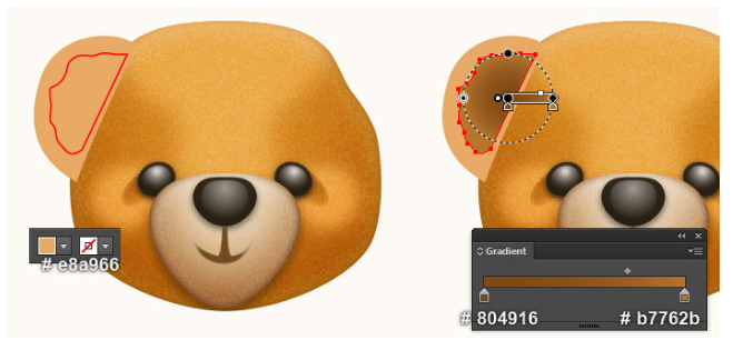 이제 곰돌이의 귀를 만들 것입니다. 펜 도구(P)를 선택하고 첫 번째 이미지와 두 번째 이미지에서 보는 것과 같은 두 개의 개체를 만드십시오. 일단 물체를 그리면, 큰 물체를 다시 선택하고, 그 물체의 획을 제거하고 이 물체에 부드러운 오렌지(# e8a9666)를 채우십시오. 그런 다음 나머지 개체를 선택하고 획을 제거한 다음 네 번째 이미지에 표시된 것처럼 이 개체를 방사형 그라디언트로 채우십시오. 마지막으로 3px 가우시안 블러 효과를 도형에 적용하십시오.