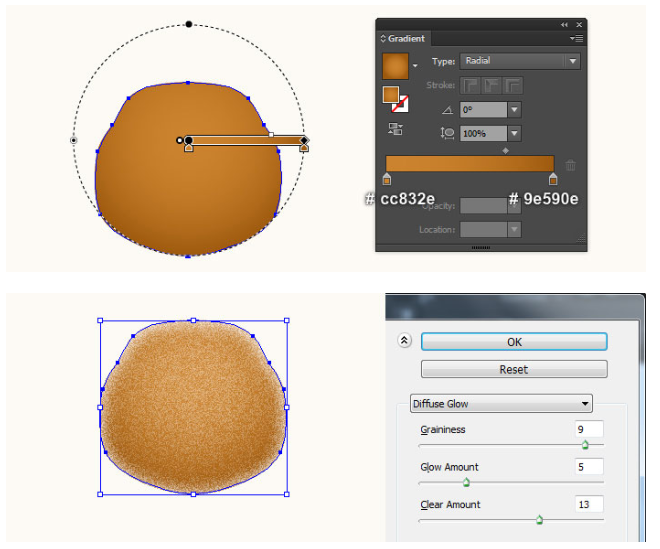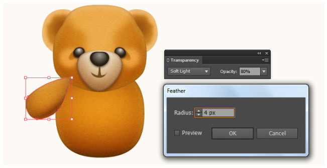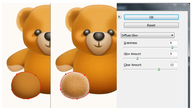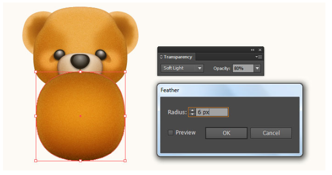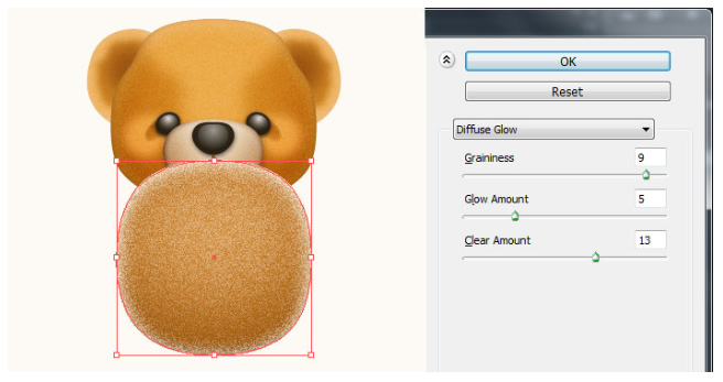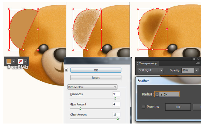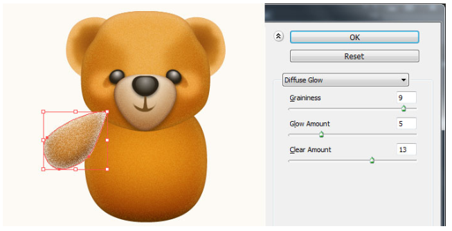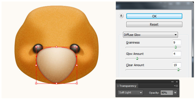 13단계에서 만들어진 모양을 선택하고 그 모양을 복사(Ctrl +C, Ctrl +F)한 다음 사본의 기존 채우기 색상을 새 방사형 그래디언트로 교체한다. 결과 모양을 선택하고 효과 > 왜곡 > 확산 글로우… 두 번째 이미지에 표시된 대로 데이터를 따라 확인을 클릭하십시오. 결과 모양에 6px 페더 효과를 적용한 다음 블렌딩 모드를 소프트라이트로 변경하고 불투명도를 80%로 줄이십시오. 마지막으로 곰 본체의 두 가지 모양을 다시 선택한 다음 뒤로 보내십시오( Ctrl +Shift + ] ).