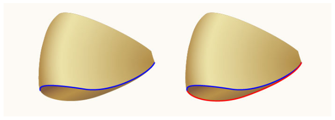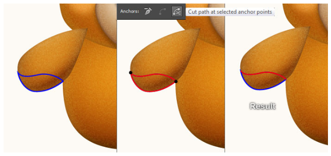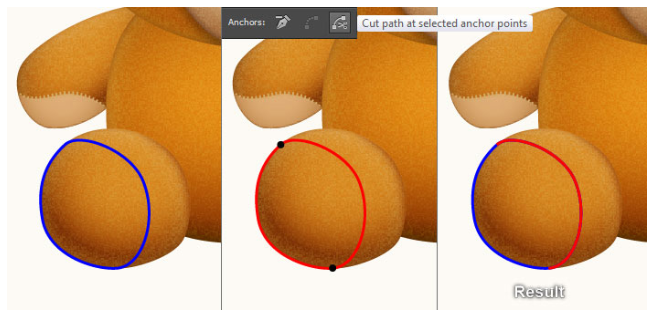 펜 도구(P)를 선택하고 첫 번째 이미지에서 보는 것처럼 파란 물체를 만드세요. 객체를 그리면 사본(Ctrl +C, Ctrl +F)을 만든 다음 사본의 기존 스트로크 색상을 빨간색으로 바꾸십시오. 두 번째 이미지에 초점을 맞추고 검정색으로 강조 표시된 두 개의 앵커 포인트를 선택한 다음 속성에서 "선택한 앵커 포인트에서 경로 잘라내기" 아이콘을 클릭하면 빨간색 객체가 두 개의 경로가 된다. 하부 경로를 선택하고 제거하십시오.