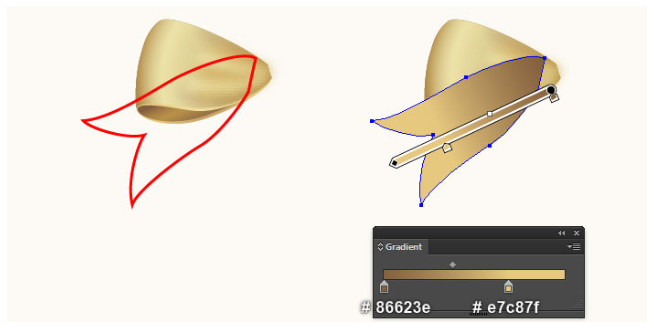 펜 도구(P)를 선택하고 첫 번째 이미지에서 보는 것처럼 빨간색 물체를 만드세요. 빨간색 개체를 다시 선택하고 스트로크를 제거한 후 두 번째 이미지에 표시된 선형 그라데이션으로 개체를 채우십시오. 다음으로 펜 도구(P)와 그라데이션 도구(G)의 도움을 받아 아래 이미지에서 볼 수 있는 것과 같은 네 가지 모양을 만드십시오.