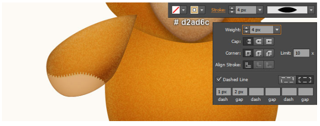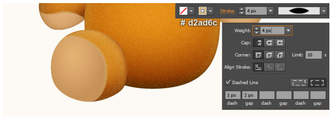 빨간색 경로를 계속 선택하고 기존 스트로크 색상을 약간 주황색(# d2ad6c)으로 교체한 후 스트로크 중량을 4px로 변경하십시오. 그런 다음 결과 경로에 너비 프로파일 1을 적용하십시오. 이 경로가 여전히 선택되어 있는지 확인하고 Stroke 패널(Window > Stroke)을 여십시오. 점선 상자를 선택한 다음 대시 상자에 1px, 간격 상자에 2px를 입력하십시오.