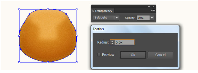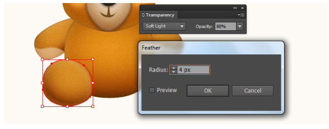 그런 다음 새로 생성된 타원에 4px 페더 효과를 적용하십시오. 이제 이 단계에서 생성된 두 개체를 다시 선택한 다음 4단계에서 적용된 Diffuse Glow 효과를 사용하여 모양 뒤에 숨깁니다.