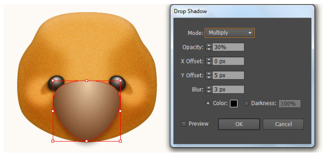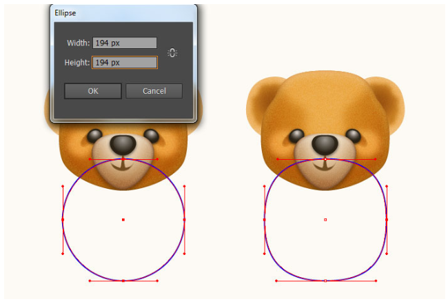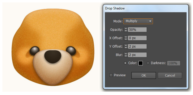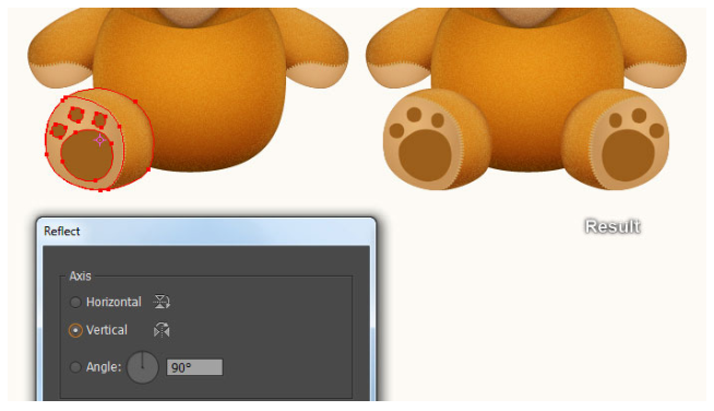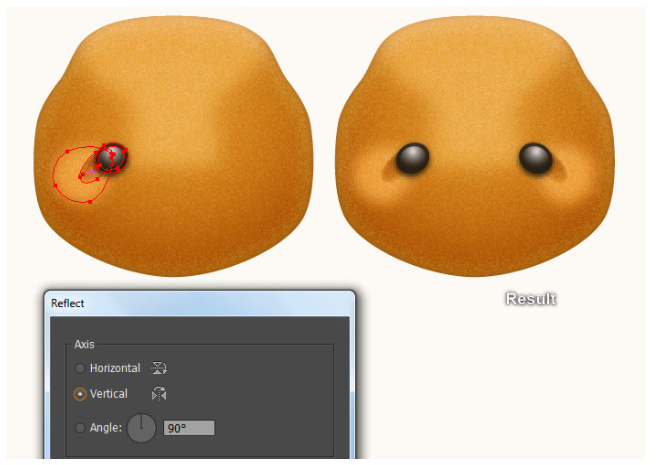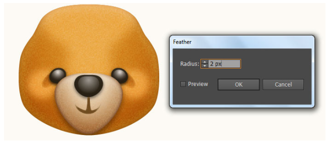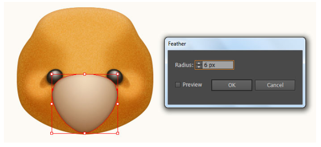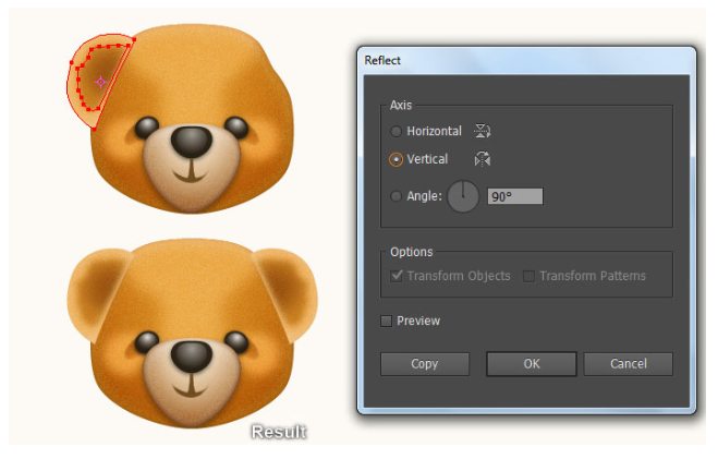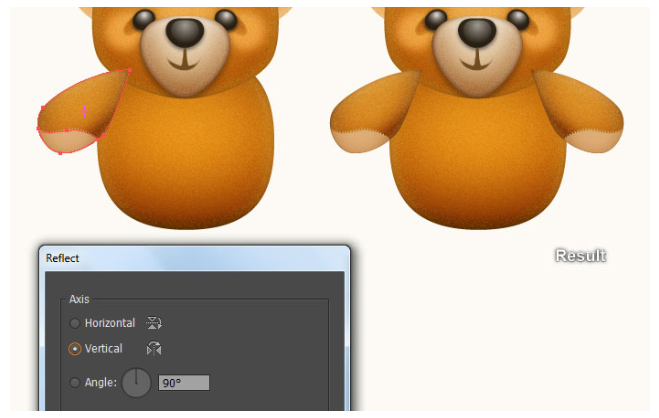 결과 모양에 2px 페더 효과를 적용한 다음 블랜딩 모드를 소프트라이트로 변경하고 불투명도를 80%로 줄이십시오. 이제 11단계부터 지금까지 만들어진 세 개의 도형을 다시 선택하고 Object > Transform > Reflect… 로 이동합니다. 수직(Vertical)을 선택하고 복사(Copy)를 누르십시오. 그런 다음 이 복사본을 오른쪽으로 끌어 마지막 이미지 옆에 표시된 대로 배치하십시오. 마지막으로 두 귀의 모든 모양을 선택하고 뒤로 보내십시오( Ctrl +Shift + [ ). 이제 곰의 머리는 준비되었고 마지막 이미지처럼 보입니다.