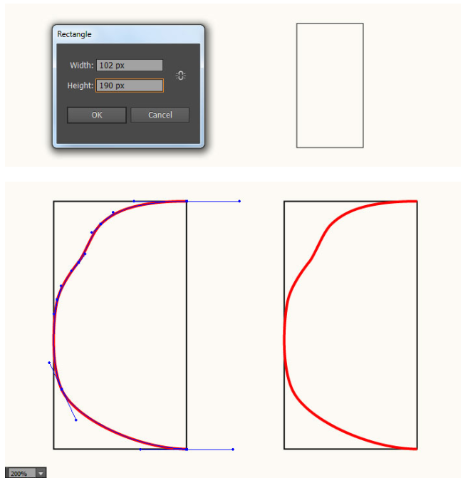 직사각형 도구(M)를 선택하고 102 X 190px 검은색 직사각형을 만든다. 그런 다음 펜 도구(P)를 선택하고 두 번째 및 세 번째 이미지에서 보는 것처럼 빨간색 곡선 경로를 만드십시오. 경로를 그리면 다시 선택하고 반사 도구(O)를 선택한 다음 Alt를 누르고 검은색 사각형의 오른쪽을 클릭하십시오. 반사 대화 상자에서 수직을 선택하고 복사를 누르십시오.
