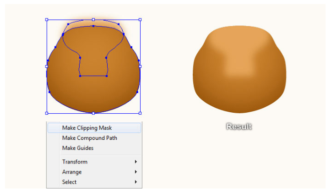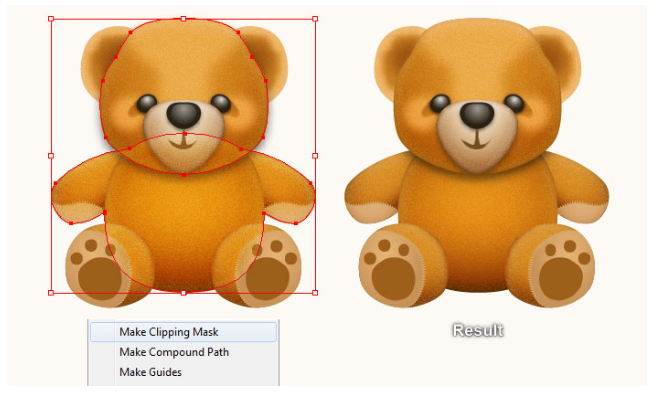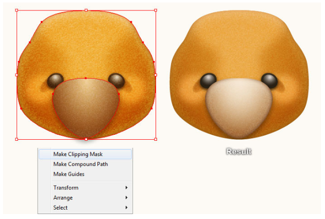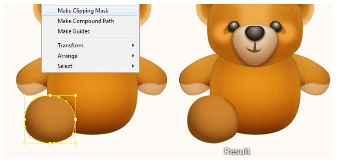 이 도형을 선택한 상태로 Shift 키를 누른 상태에서 이 단계에서 블러 효과가 적용된 도형을 클릭하십시오. 아트보드를 마우스 오른쪽 버튼으로 누른 다음 드롭다운 메뉴에서 Make Clipping Mask(클리핑 마스크 만들기) 섹션을 선택하십시오. 마지막으로 베개 세트를 곰의 머리 뒤에 감추세요.