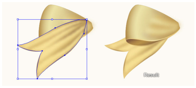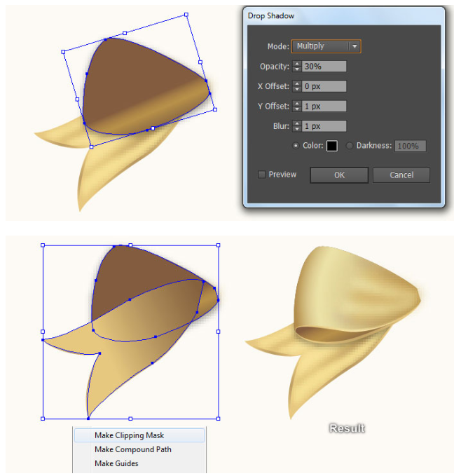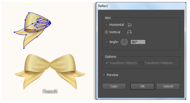 그런 다음 24단계에서 만들어진 첫 번째 모양 뒤에 클리핑 세트를 숨긴다. 이제 활의 왼쪽 부분에 있는 모든 물체를 선택하고 물체(Object) > 변환(Transform) > 반사(Reflect)로 이동하십시오. 수직(Vertical)을 선택하고 복사(Copy)를 누르십시오. 그런 다음 이 복사본을 오른쪽으로 끌어 마지막 이미지에 표시된 대로 배치하십시오.