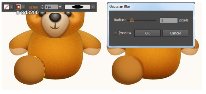 다음은 곰돌이 인형의 다리를 만들 것입니다. 펜 툴(P)과 그라데이션 툴(G)로 첫 번째와 두 번째 이미지에서 보는 것처럼 강렬한 오렌지 모양을 만듭니다. 세 번째 이미지에 초점을 맞추고 펜 도구(P)로 곡선을 그은 다음 순간 4px 다크 오렌지 스트로크(# 8d3200)를 준다. 그런 다음 새로 생성된 경로에 대해 너비 프로파일 1과 3px 가우시안 블러 효과를 적용하십시오. 이제 이 단계에서 만들어진 첫 번째 도형을 다시 선택하고 복사(Ctrl +C, Ctrl +F)한 다음 복사본을 앞으로 가져오십시오( Ctrl +Shift +] ). 그래도 이 복사본을 선택한 상태에서 Shift 키를 누른 채 이 단계에서 적용된 흐릿한 효과가 있는 경로를 클릭하십시오. 아트보드를 마우스 오른쪽 버튼으로 누른 다음 드롭다운 메뉴에서 Make Clipping Mask(클리핑 마스크 만들기) 섹션을 선택하십시오.