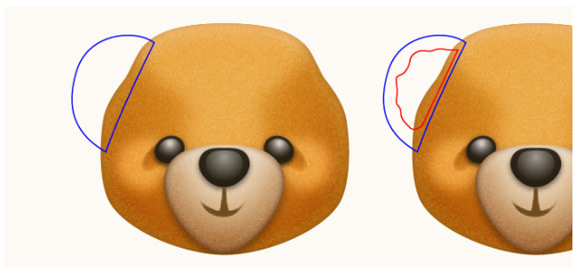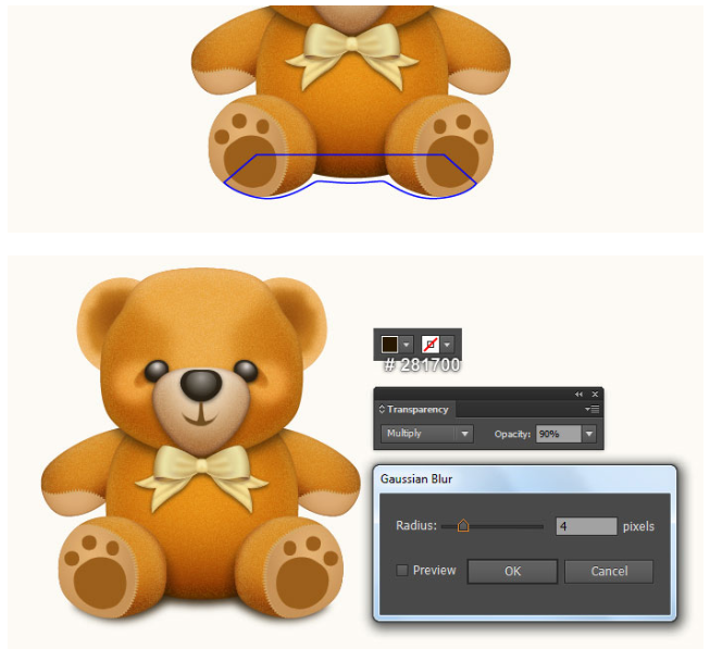 펜 도구(P)를 선택하고 첫 번째 이미지에서 보는 것처럼 파란색 개체를 만드십시오. 물체가 그려지면 스트로크를 제거하고 이 물체를 검은색으로 채우십시오(# 281700). 결과 모양에 4px 가우시안 블러 효과를 적용한 다음 혼합(블랜딩) 모드를 곱하기로 변경하고 불투명도를 90%로 줄이십시오. 마지막으로 곰 뒤에 그림자 모양을 숨깁니다.