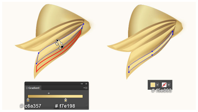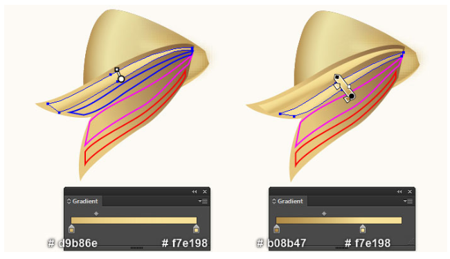 펜 도구(P)와 그라디언트 도구(G)를 계속 사용하여 다음 네 개의 마지막 이미지에서 보는 것처럼 두 가지 모양을 만드십시오. 다음으로 이 단계에서 생성된 마지막 모양을 다시 선택하고 2px 페더 효과를 적용하십시오. 마지막으로 이 단계에서 만들어진 첫 번째 모양 뒤에 결과 모양을 숨기십시오.