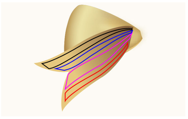펜 도구(P)를 선택하고 첫 번째 이미지와 두 번째 이미지에서 보는 것처럼 두 개의 곡선을 만든다. 경로를 그리면 파란색 경로를 다시 선택하고 기존 스트로크 색상을 세 번째 이미지와 같이 스트로크 내 반지름 그라데이션으로 교체하십시오. 그런 다음 결과 경로에 너비 프로파일 1을 적용하십시오. 빨간색 경로를 계속 선택하고 기존 스트로크 색상을 마지막 영상에 표시된 것처럼 스트로크 내의 방사형 그라데이션으로 교체하십시오. 마지막으로 결과 경로에 너비 프로파일 1을 적용하십시오.
