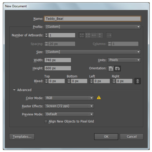 일러스트레이터를 실행한 다음 (Ctrl + N)를 눌러 장치 드롭다운 메뉴에서 새 픽셀 선택을 만들고 너비 상자에 740을 입력하고 높이 상자에 600을 입력한 다음 고급 버튼을 클릭하십시오. RGB, 화면(72ppi)을 선택하고 확인을 클릭하기 전에 새 개체를 픽셀 그리드에 맞춤 상자를 선택 취소했는지 확인하십시오.