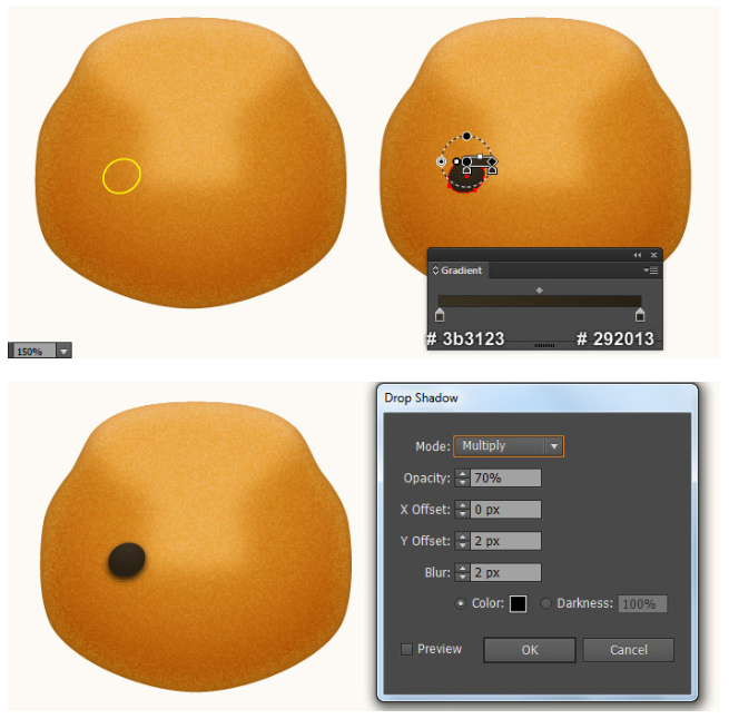 코와 입을 그릴 것 입니다. 펜 도구(P)와 그라디언트 도구(G)의 도움을 받아 첫 번째와 두 번째 이미지에서 보는 것과 같은 모양을 만드십시오. 새로 만든 모양의 복사본(Ctrl +C, Ctrl +F)을 만든 다음 세 번째 이미지와 같이 복사본의 기존 채우기 색상을 새 방사형 그라디언트로 교체하십시오. 마지막으로 결과 모양에 6px 페더 효과를 적용하십시오.