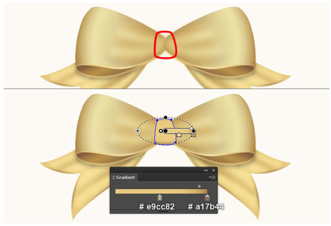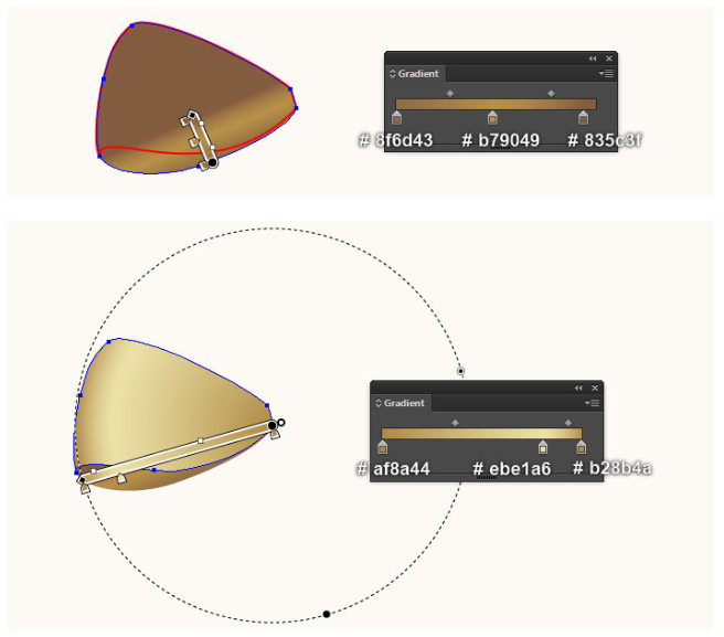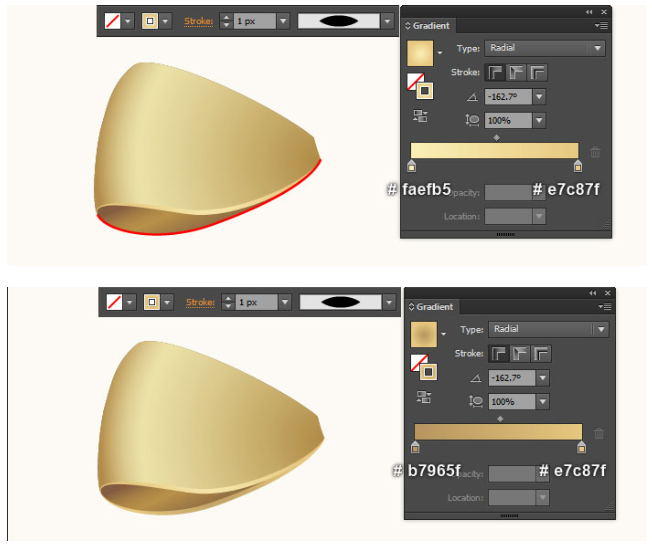 이제 이 단계에서 생성된 검은색 개체를 다시 선택하고 스트로크를 제거한 후 마지막 이미지 옆에 표시된 선형 그라데이션으로 개체를 채우십시오. 빨간색 개체를 계속 선택하고 스트로크를 제거한 다음 마지막 이미지에서 보는 것처럼 이 개체를 방사형 그래디언트로 채우십시오.