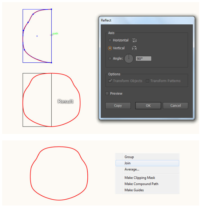 5단계 시작부터 이 시간까지 생성된 모든 객체를 선택하고 Object > Transform > Reflect… 수직을 선택하고 복사를 누르십시오. 그런 다음 이 복사본을 오른쪽으로 끌어 두 번째 이미지에 표시된 대로 배치하십시오.