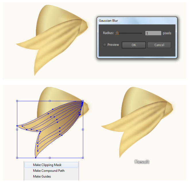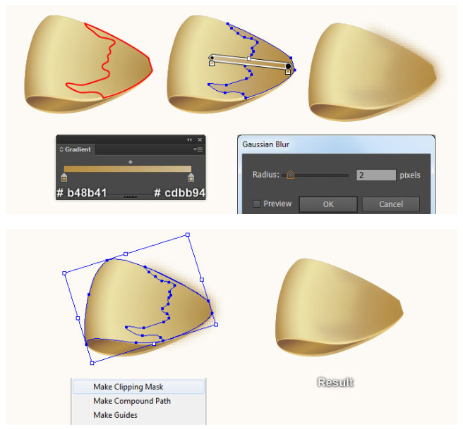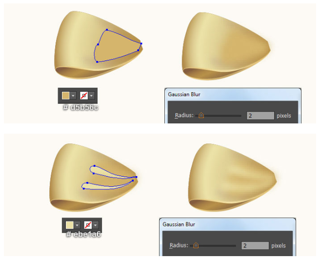 여전히 이 복사본을 선택한 상태에서 Shift 키를 누른 채 이 단계에서 적용된 흐릿한 효과의 모양을 클릭하십시오. 아트보드를 마우스 오른쪽 버튼으로 누른 다음 드롭다운 메뉴에서 Make Clipping Mask(클리핑 마스크 만들기) 섹션을 선택하십시오. 펜 도구(P)로 계속 진행하여, 마지막 4개의 이미지와 같이 약간의 모양(# d5b56c)과 매우 부드러운 오렌지 모양(# ebe1a6)을 만든다. 도형이 그려지면 2px 가우시안 블러 효과를 적용하십시오.