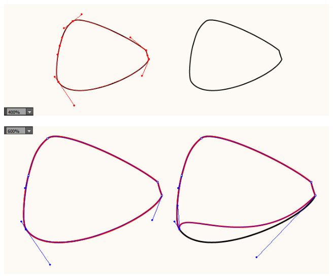 앵커 포인트 도구 (Convert Anchor Point Tool(Shift +C))을 사용하여 빨간색 물체의 왼쪽 하단 앵커 포인트 하단 핸들을 클릭하고 마우스를 누른 다음 왼쪽 위로 끌어 올리십시오. Convert Anchor Point Tool(Shift +C)을 계속 사용하여 오른쪽 하단 앵커 포인트의 하단 핸들을 클릭하고 마우스를 누른 다음 왼쪽과 아래로 끌어다 놓으십시오.