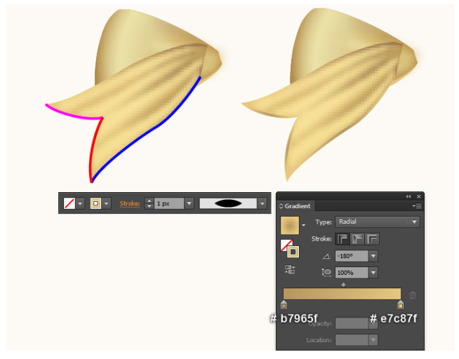 펜 도구(P)를 선택하고 첫 번째 이미지에서 보는 것처럼 세 개의 곡선을 만든다. 경로를 그리면 두 번째 이미지와 같이 스트로크 내에서 경로를 다시 선택하고 기존 스트로크 색상을 방사형 그라데이션으로 교체하십시오. 그런 다음 결과 경로에 너비 프로파일 1을 적용하십시오. 이제 27단계 시작부터 지금까지 생성된 모든 개체를 선택하고 뒤로 보내십시오( Ctrl +Shift + [ ).