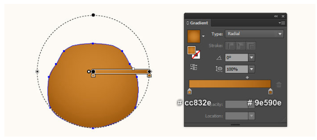 왼쪽 경로를 선택하고 제거하십시오. 이제 이 단계에서 생성된 파란색 개체를 다시 선택하고 스트로크를 제거하고 네 번째 이미지에 표시된 것처럼 이 개체를 방사형 그래디언트로 채우십시오. 빨간색 경로를 계속 선택하고 기존 스트로크 색상을 약간 주황색(# d2ad6c)으로 교체한 후 스트로크 중량을 4px로 변경하십시오. 그런 다음 결과 경로에 너비 프로파일 1을 적용하십시오. 이 경로가 여전히 선택되어 있는지 확인하고 스트로크 패널(Window > Stroke)을 여십시오. 점선 상자를 선택한 다음 대시 상자에 1px, 간격 상자에 2px를 입력하십시오.