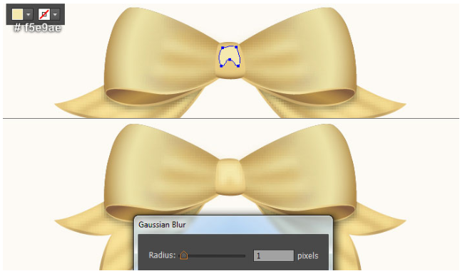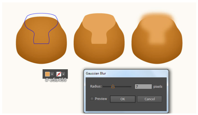 펜 툴(P)을 선택하고 첫 번째 이미지와 두 번째 이미지에서 보는 것처럼 부드러운 오렌지 모양(# e5a459)을 만든다. 새로 생성된 모양을 선택하고 효과 > 블러 > 가우스 블러로 이동… 7px 반지름을 입력하고 확인을 클릭하십시오.
