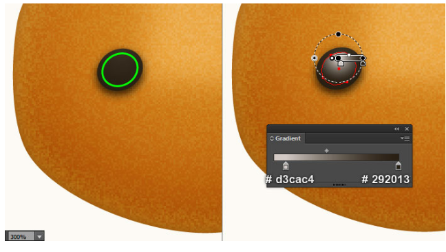 눈을 그릴 시간입니다. 타원 도구(L)를 선택하고 타원을 만든 다음 첫 번째 이미지에서 보는 것처럼 위치에 배치하십시오. 새로 생성된 타원의 선을 제거한 다음 두 번째 이미지와 같이 표시된 대로 반지름 그라데이션으로 이 물체를 채웁니다. 새로 생성된 타원을 다시 선택하고 타원 > 스타일 > 드롭 섀도우로 이동하십시오.