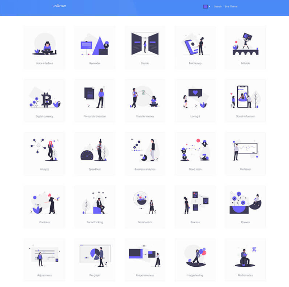 테마에서 일러스트를 찾거나 원하는 일러스트 레이터의 스타일에서도 검색 할 수 있습니다.