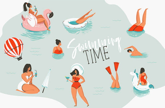 수영복의 여자와 플라밍고, 고유 콘형 튜브, 돌고래 등 여름을 테마로 한