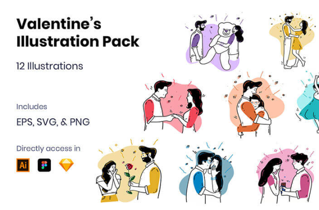 발렌타인 데이를 테마로 사랑을 서로 확인하는 커플의 일러스트 12 종류.