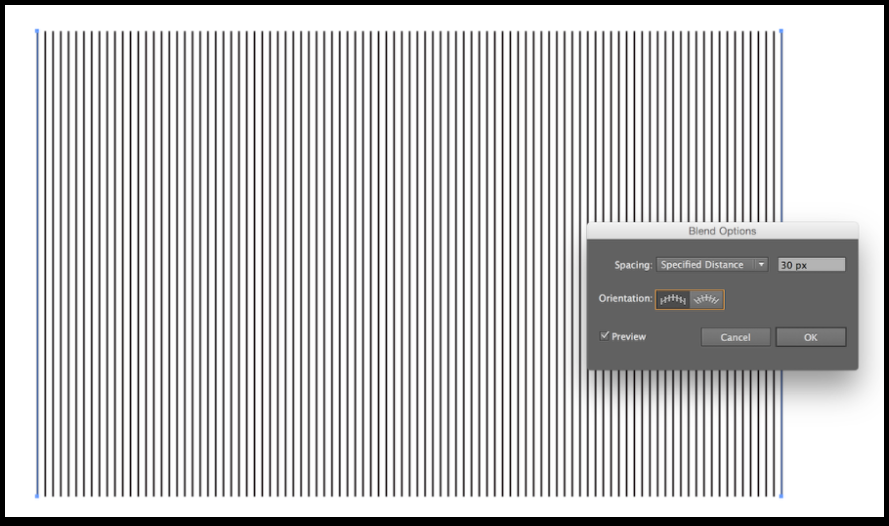 혼합 도구를 선택하고 두 세그먼트를 탭하여 혼합 개체를 만듭니다. 그 후 Blend Tool 아이콘을 두 번 클릭하여 Blend Options 대화 상자 를 엽니 다 . 변경 지정된 거리에 간격을 사용할 30 개 픽셀을 그것을 위해.