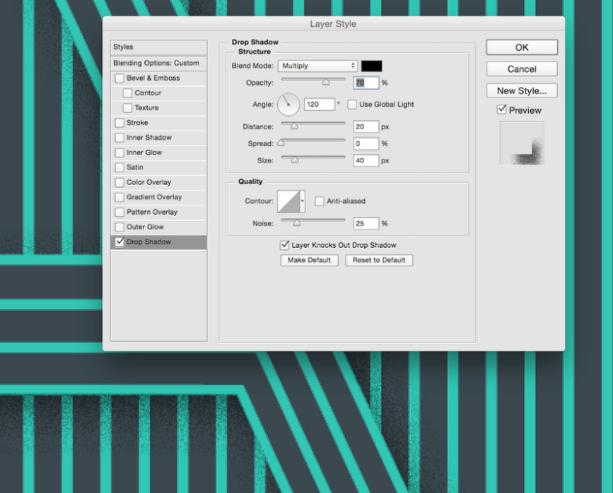 그림자 옵션의 경우 혼합 모드, 120º 각도, 20 픽셀 거리, 40 픽셀 크기 및 가장 중요한 25 % 노이즈에 곱하기를 사용했습니다 . 다소 균일 한 벡터 일러스트에 멋진 질감을 추가하기 때문에 소음이 정말 멋집니다.