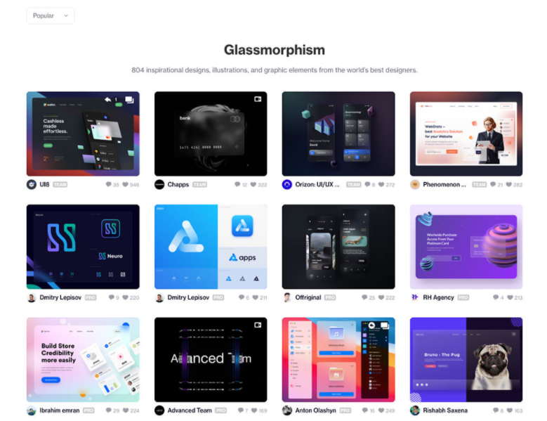 드리블은 전 세계 디자이너들이 만든 글래스모피즘 스타일을 사용한 작품들로 가득합니다.