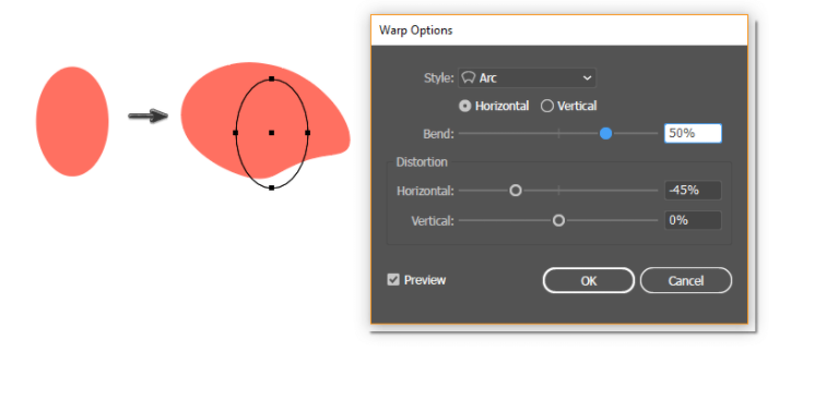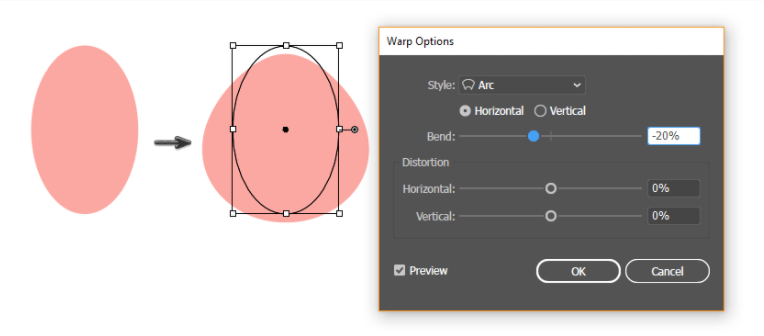 그런 다음 Warp > Effect > Arc로 이동하여 아래에 표시된 옵션을 입력하고 도형을 펼칩니다.