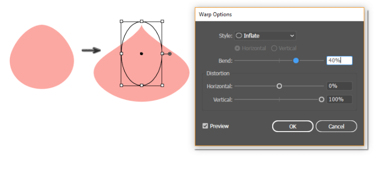 그런 다음 Effect > Warp > Inflate 효과 > 왜곡 > 팽창으로 이동하여 영상에 표시되는 새 옵션을 입력합니다. 그런 다음 도형을 펼칩니다 (Object > Expand Appearance (개체 > 모양 확장))