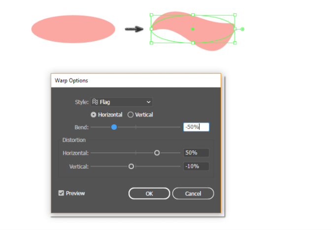 타원을 선택한 상태로 유지하면서 Effect > Warp > Flag(효과 > 휘어짐 > 플래그)로 이동합니다.