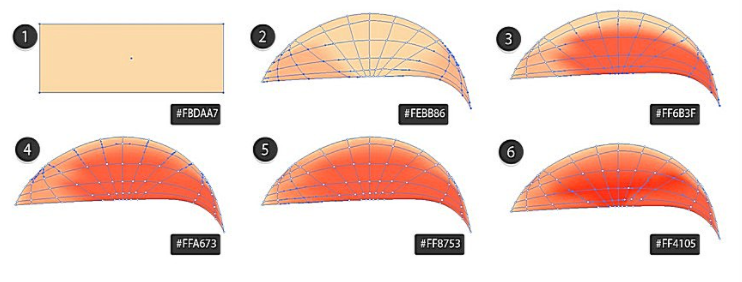 그런 다음 Mesh Tool(U)을 잡습니다. 노드를 클릭하여 메시 그리드를 만듭니다. 두꺼운 망사 그리드가 있으면 직사각형의 가장자리를 잡고 이동하여 모양이 둥글게 만듭니다. 그것은 복숭아 모양과 비슷해야 합니다.