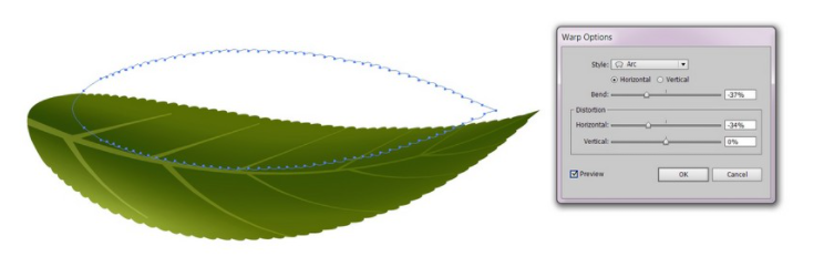 6. Effect > Warp > Arc, -37% Bending 및 -34% 수평 변형으로 잎을 구부립니다.